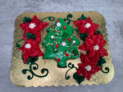 A delicious brownie in the shape of a Christmas tree on a foil board with Christmas decorations. Your choice between two beautiful designs.