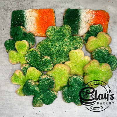 Our old fashioned sugar cookies topped with colorful sugar in shapes for St. Patrick's Day.