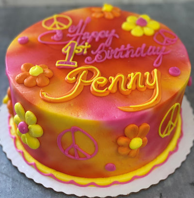 Served with a vanilla buttercream and sprayed a vibrant collection of colors. Topped with vuttercream flowers to match.